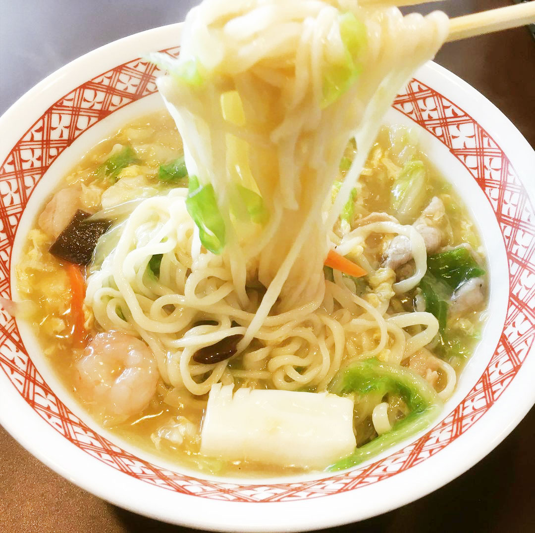 軽く炒めたたっぷりの野菜と、イカ・エビ・豚肉がスープにコクと旨味を与え、栄養バランスのとれた人気メニュー。